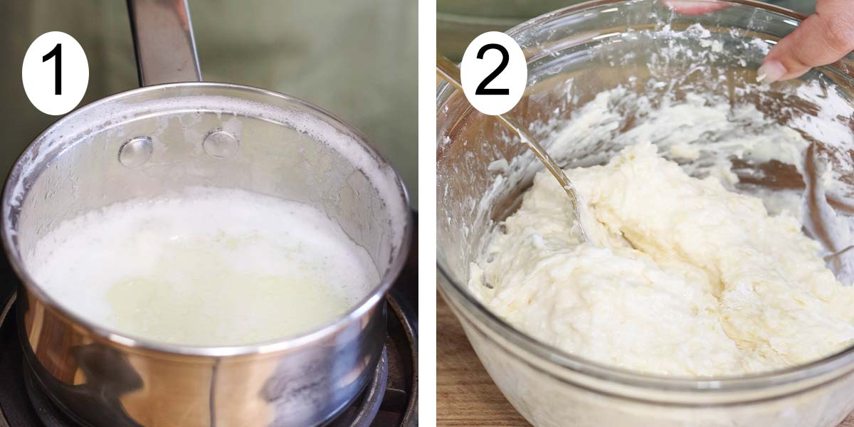 - Photo 1: The first step is adding the milk, oil, and water to a small pot and heating it up until it boils. Now, I have tested it without boiling as well, just warm liquid, and the difference is in how the batter gets.
