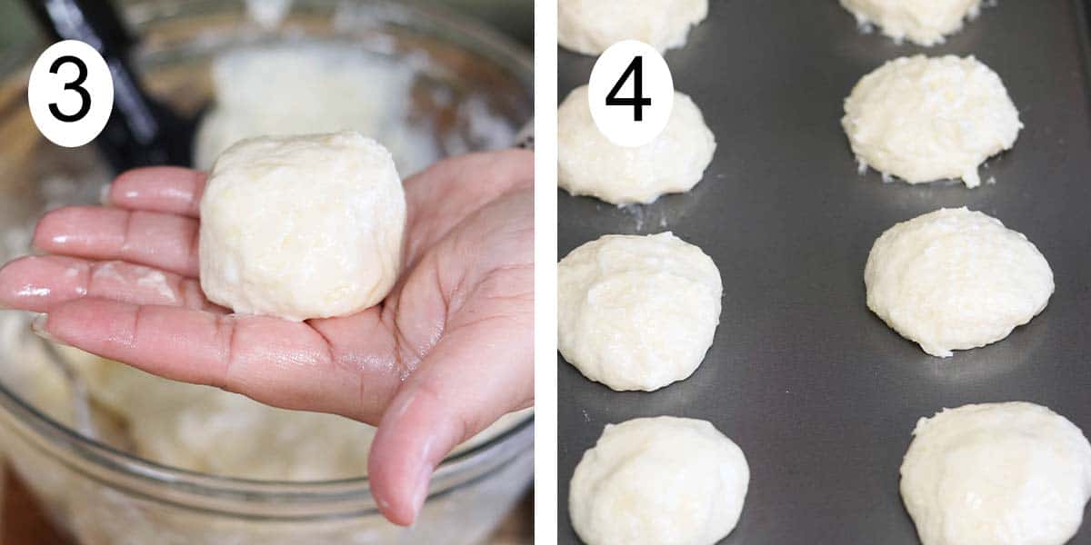 - Photo 3: Your mixture will be wet and sticky. So the first thing you want to do is to oil your hands or wet them with water. Then, take about ¼ cup of dough and roll it to roughly make it look like a ball. I use an ice cream scoop to make even balls, plus it is easier to shape this way. Shape and place on a tray. No need to use any parchment paper.